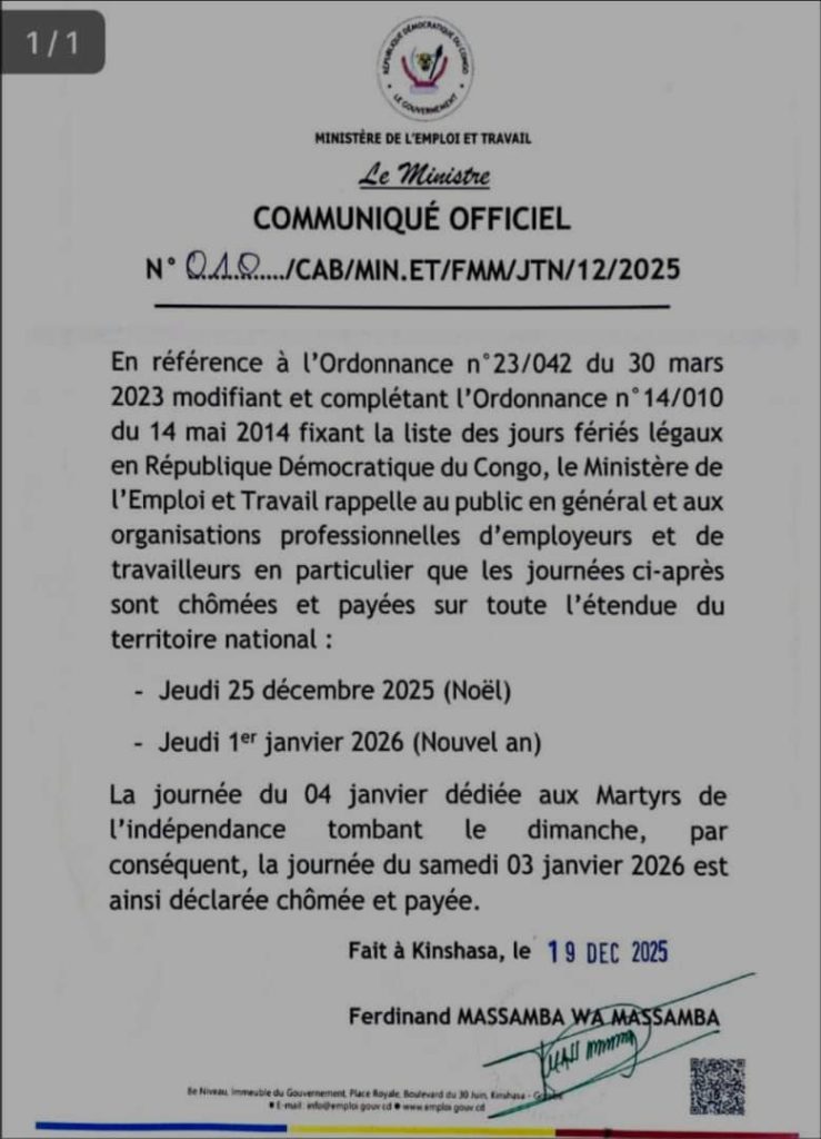Le gouvernement de la République démocratique du Congo a officiellement rappelé les jours fériés légaux à observer à l’occasion des fêtes de fin d’année 2025 et du début de l’année 2026.Dans un communiqué signé par le ministre de l’Emploi et du Travail, Ferdinand Massamba wa Massamba, les autorités précisent que trois journées seront chômées et payées sur l’ensemble du territoire national. Il s’agit du jeudi 25 décembre 2025, célébrant la fête de Noël, du jeudi 1er janvier 2026, marquant le Jour de l’An, ainsi que du samedi 3 janvier 2026, déclaré journée chômée et payée en remplacement du dimanche 4 janvier, dédié aux Martyrs de l’indépendance.Ce rappel s’inscrit dans le cadre de l’Ordonnance n°23/042 du 30 mars 2023, modifiant et complétant l’Ordonnance n°14/010 du 14 mai 2014 portant fixation de la liste des jours fériés légaux en République démocratique du Congo.Le ministère de l’Emploi et du Travail invite les employeurs et les travailleurs à se conformer strictement à ces dispositions légales. Cette communication vise à permettre aux citoyens, aux entreprises et aux institutions de mieux planifier leurs activités pendant cette période festive, tout en respectant les dates symboliques de la Nation.